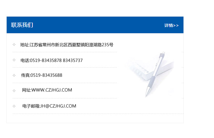 地址:常州市新北區友邦商務大廈1幢16、17層  電話:0519-85101652  傳真:0519-85112595  郵編:213022  網址:www_cz-jiayue_cn.sjzxinhong.com  郵箱:xiajifengaa@163.com